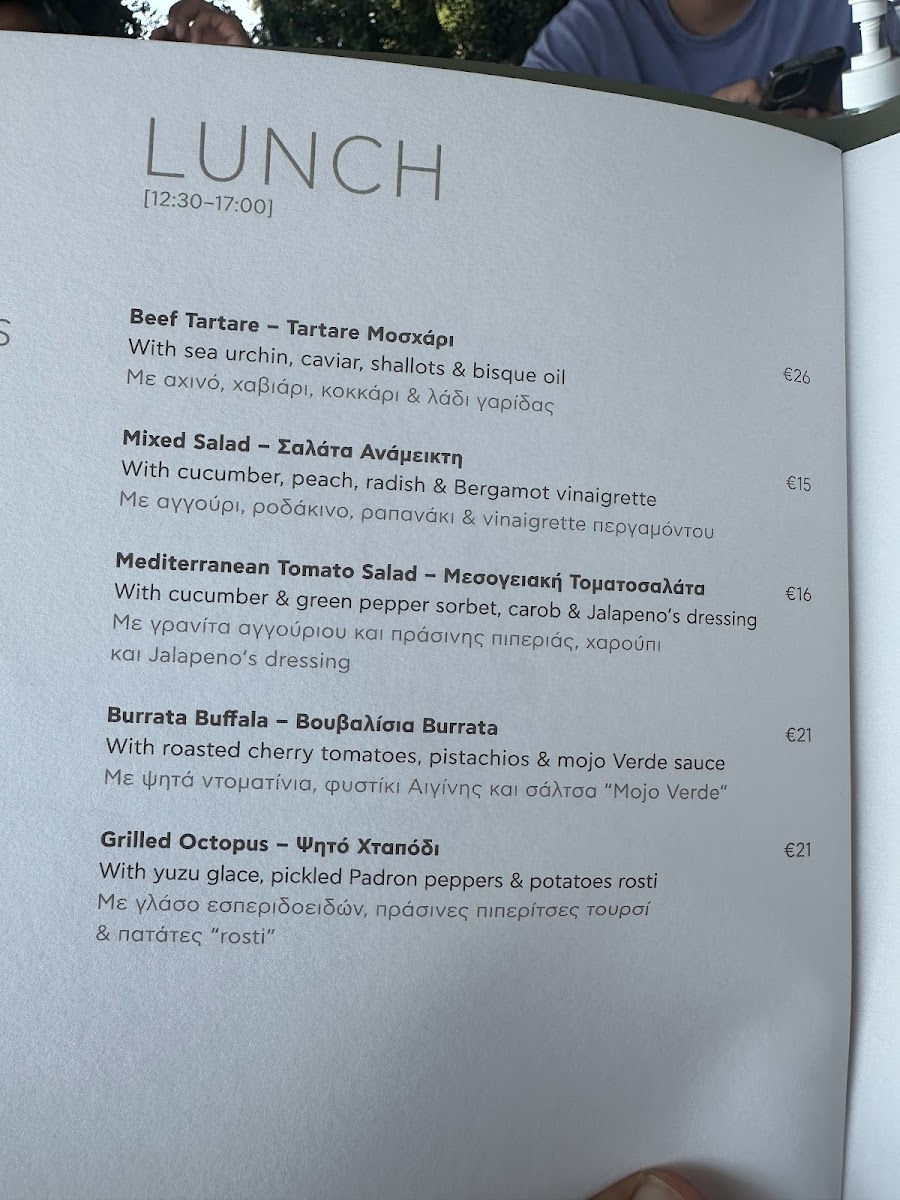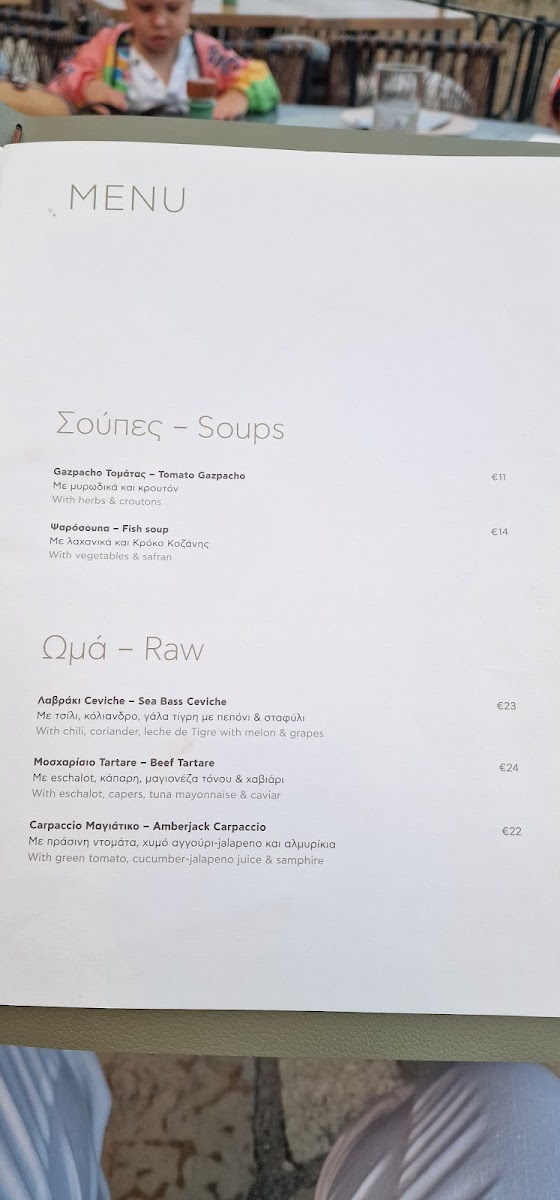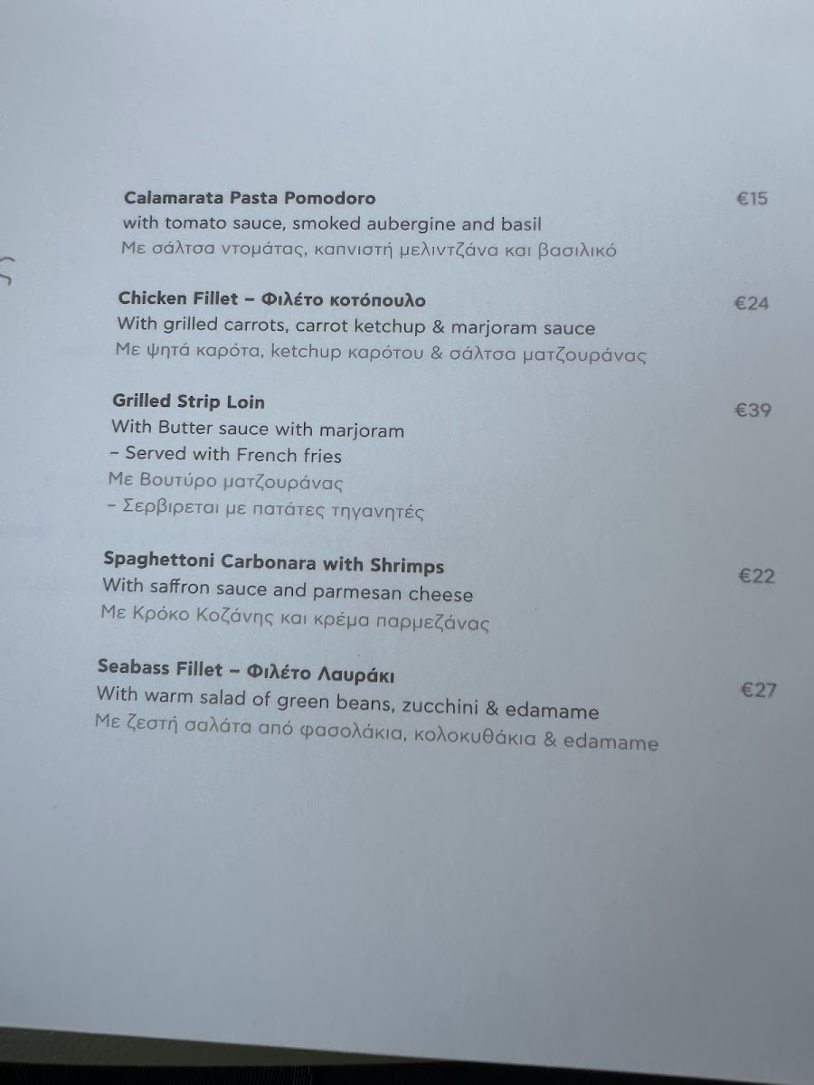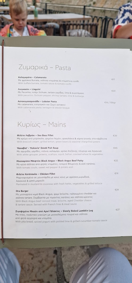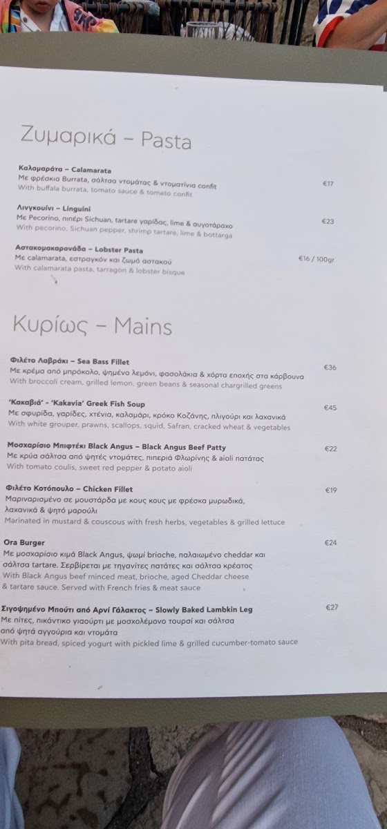 The menu at Ora Day feels carefully curated, striking a confident balance between refined Mediterranean flavors and playful contemporary twists. Seafood clearly leads the experience, with the Sea Bass Fillet and Codfish Fillet standing out for their clean presentation and emphasis on freshness, while starters like Marinated Shrimps and Fried Calamari deliver familiar coastal comfort elevated by precise seasoning. More adventurous plates such as Linguini with Pecorino Sichuan Pepper Shrimp Tartare Lime & Bottarga showcase the kitchen’s willingness to blend bold aromatics with Italian structure, creating depth without overwhelming the palate. The Beef Tartare is handled with restraint, allowing texture and balance to take center stage, while the Savoury Crumble adds an unexpected yet satisfying contrast. Sauces, particularly the Jalapeño Sauce, are used thoughtfully, adding brightness and heat rather than dominating the dish. Desserts round out the menu with equal confidence: traditional touches like Portokalopita sit comfortably alongside indulgent options such as Lemon Tart, Ζέστη Σοκολάτα, and Σοκολάτα Ζεστή Και Καπουτσίνο Μονό, offering a smooth transition from savory to sweet. Overall, the menu feels cohesive and intentional, reflecting a restaurant that values both technique and flavor harmony without unnecessary excess.